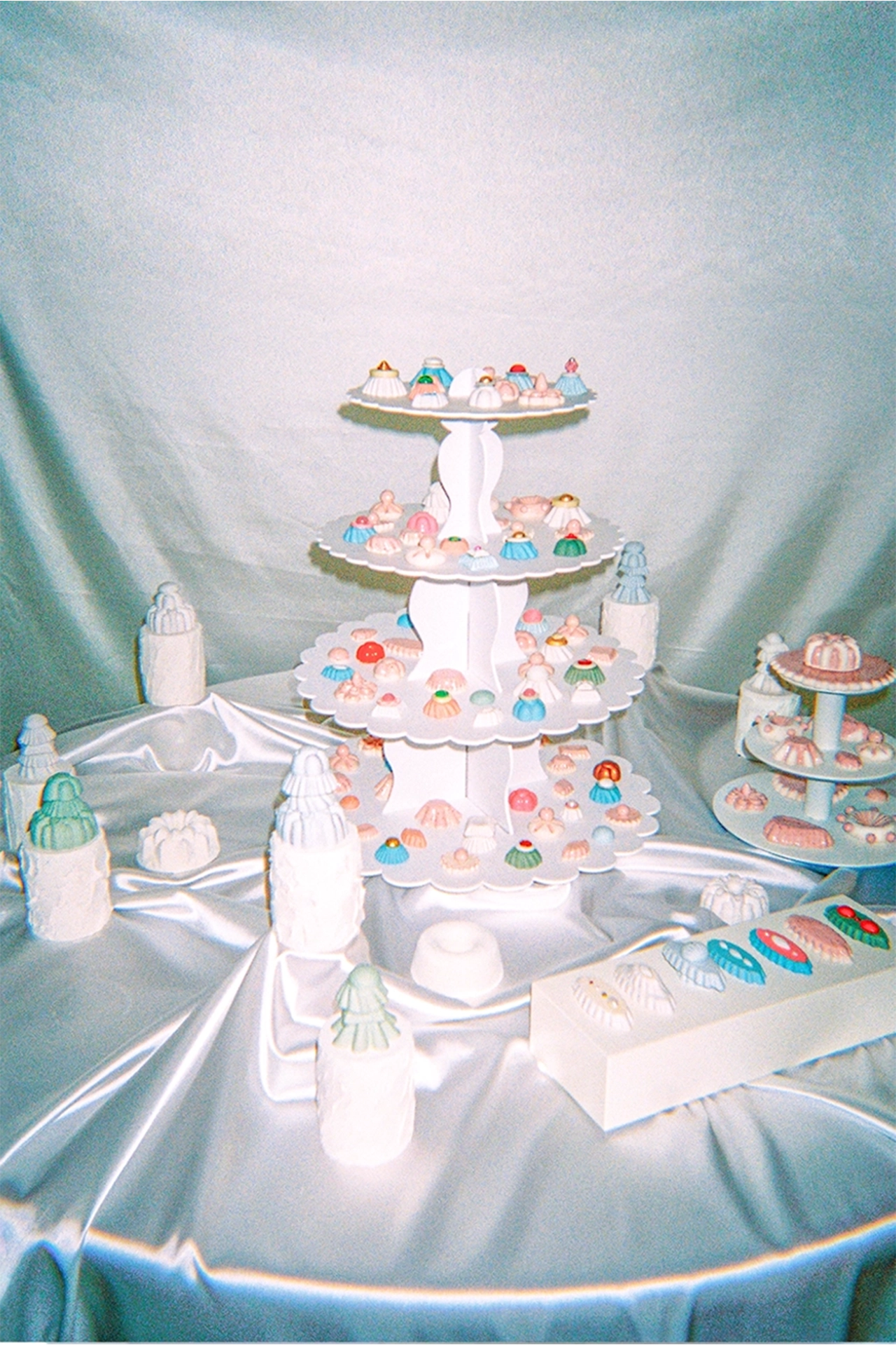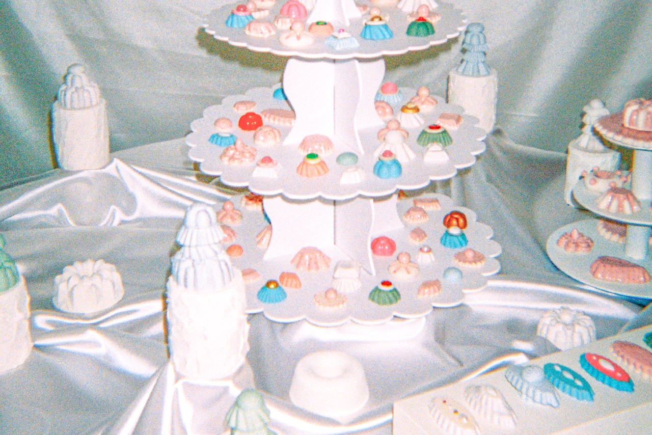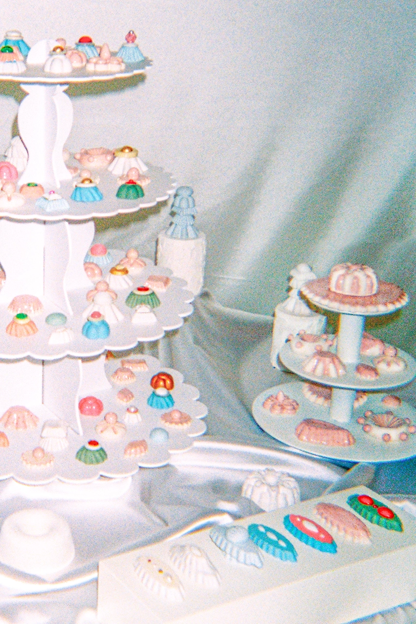 Assembled sculptures made of porcelain, glazed earthenware, cabochons, rhinestones, buttons, paint, and plaster.