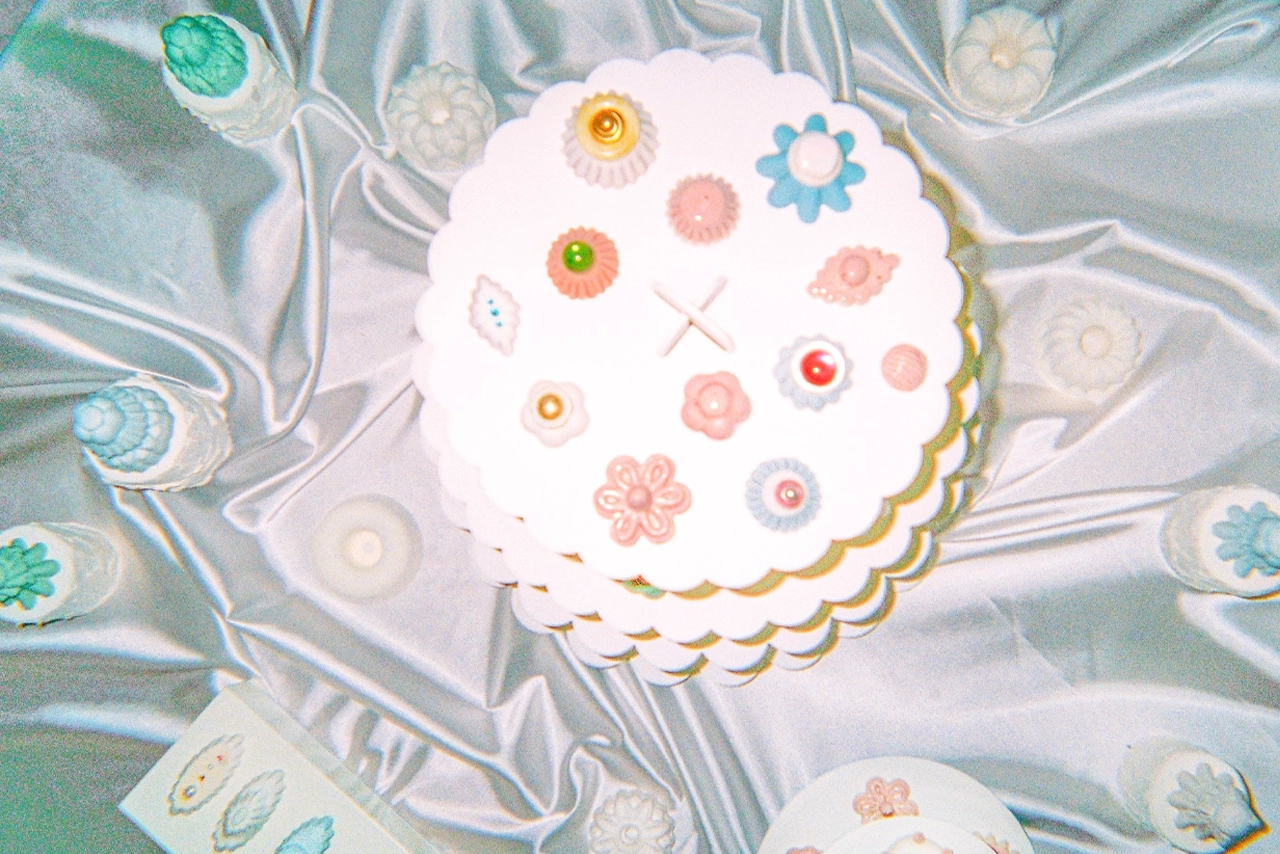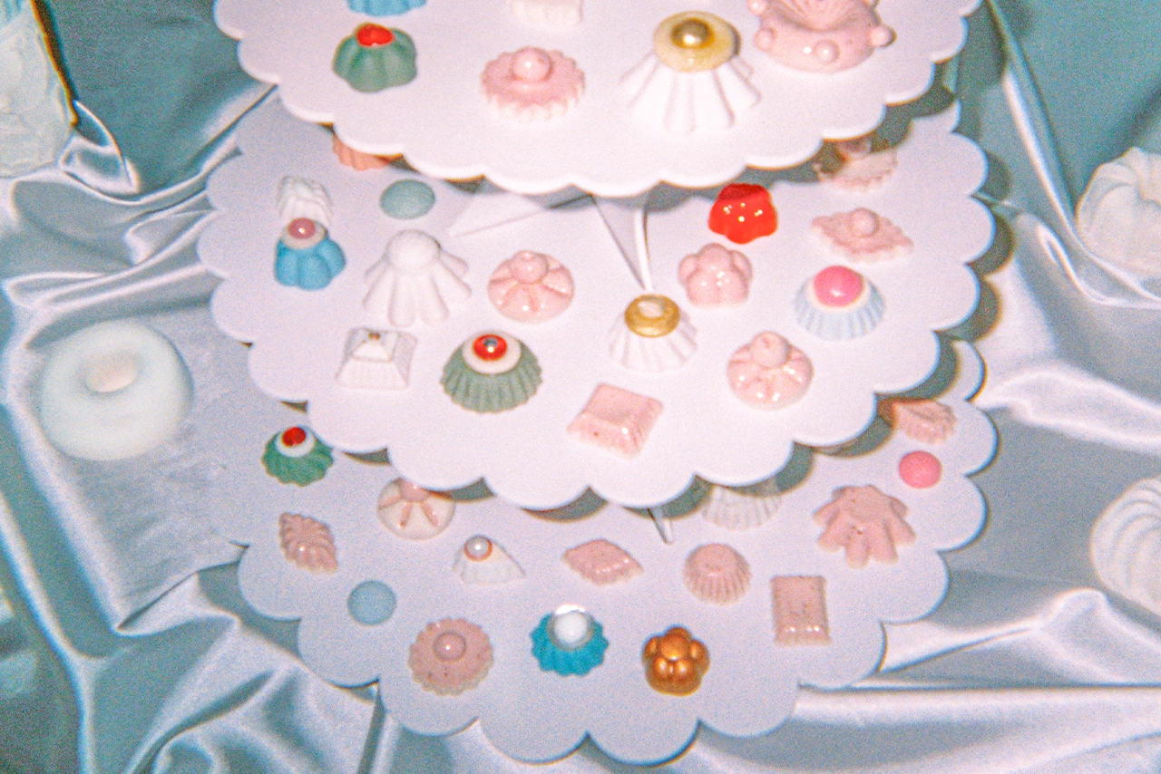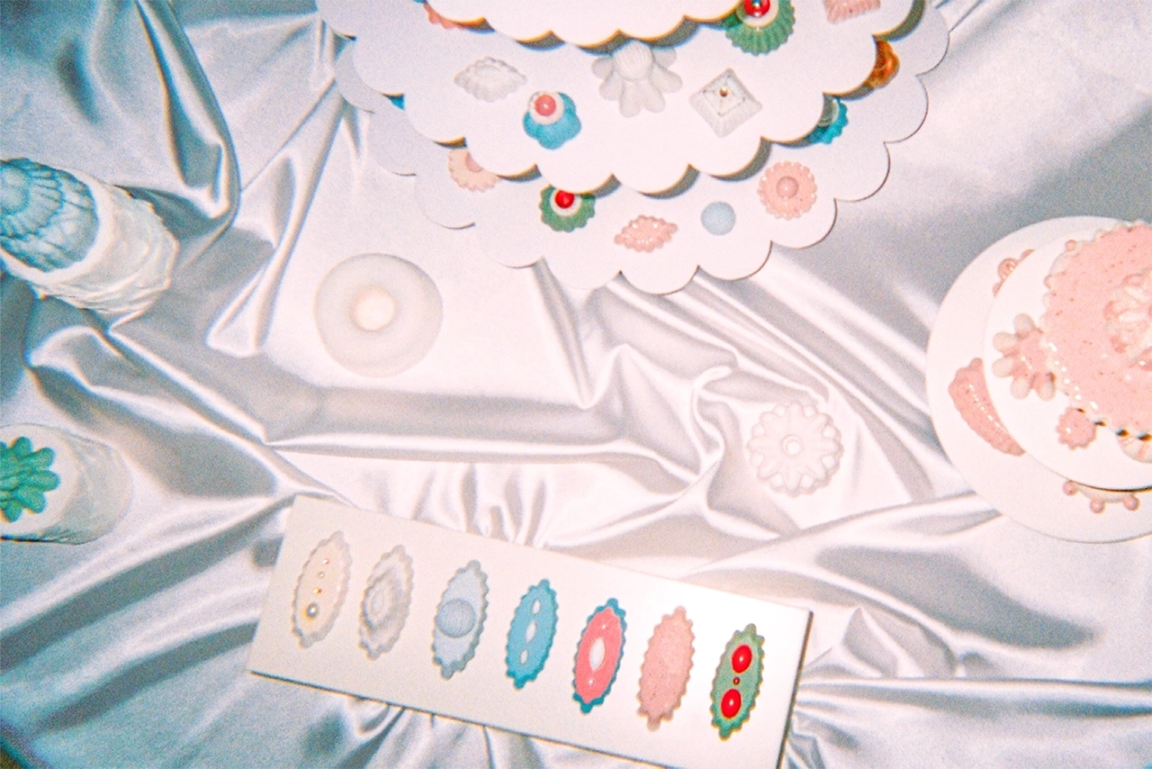 Assembled sculptures made of porcelain, glazed earthenware, cabochons, rhinestones, buttons, paint, and plaster.