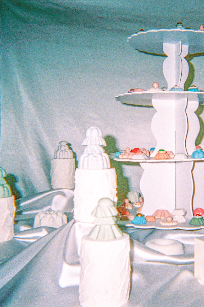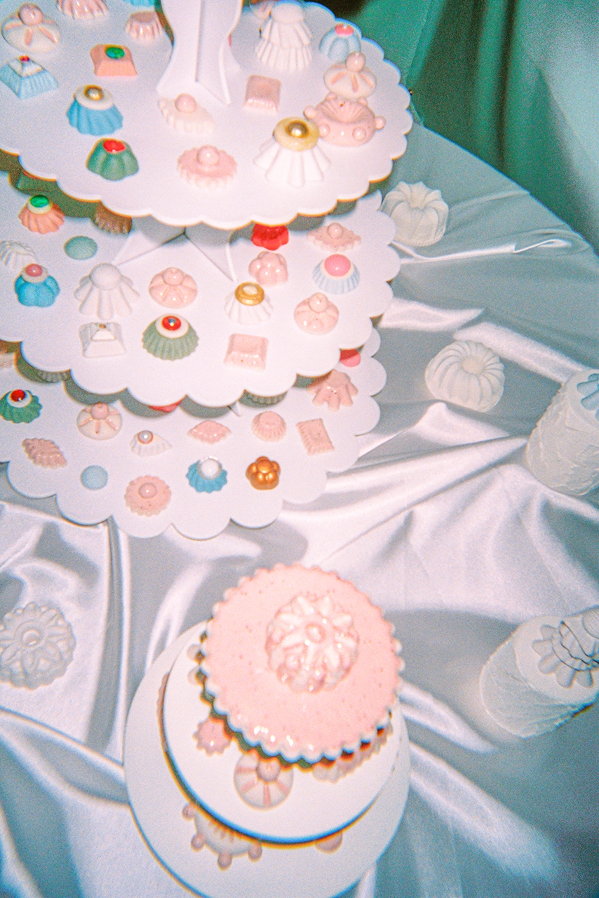 Installation for the Journées du Patrimoine exhibition organized by the association La Source Garouste Des Brillants. A buffet of delicacies, whipped cream towers, and tiered cakes.