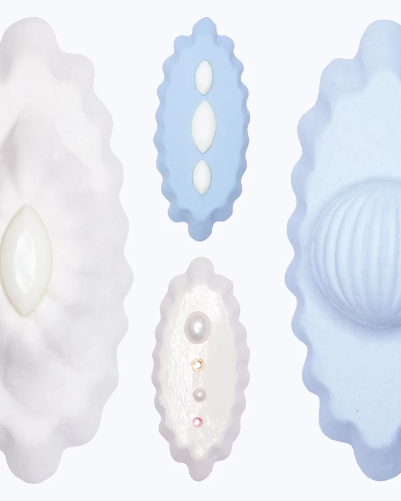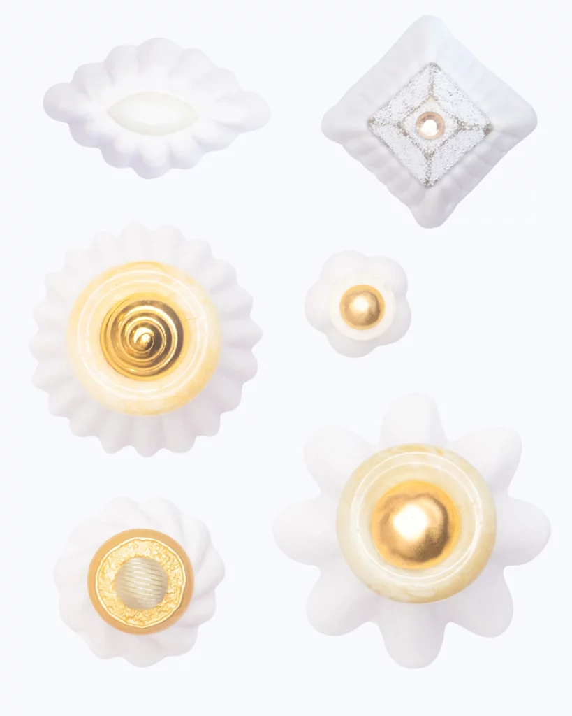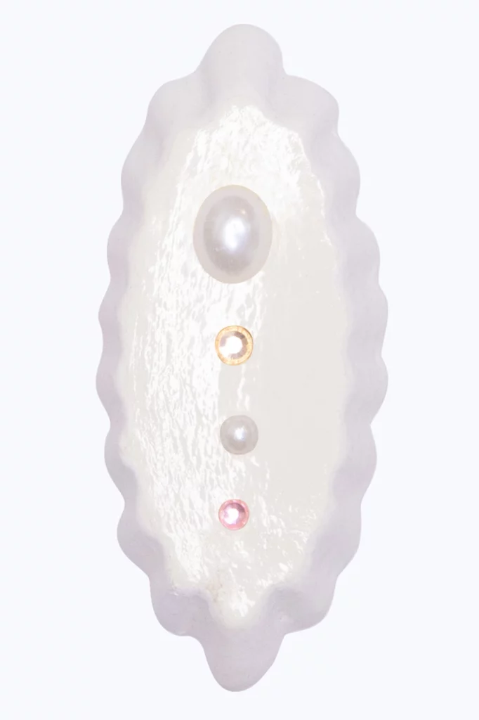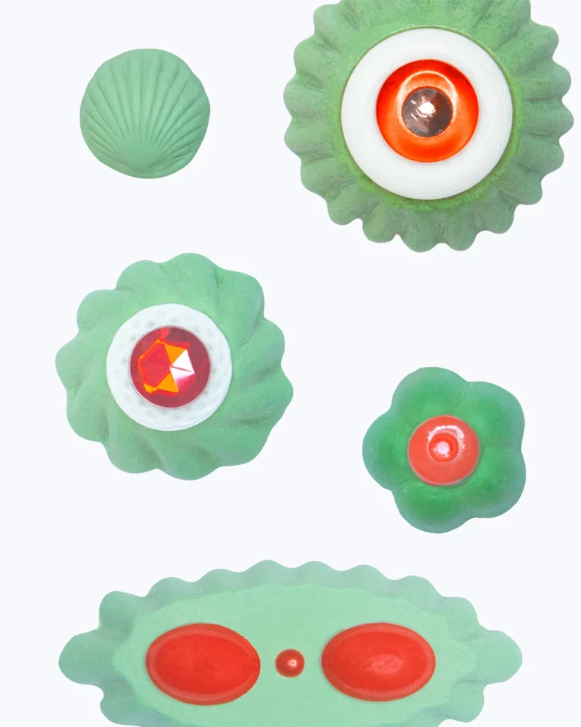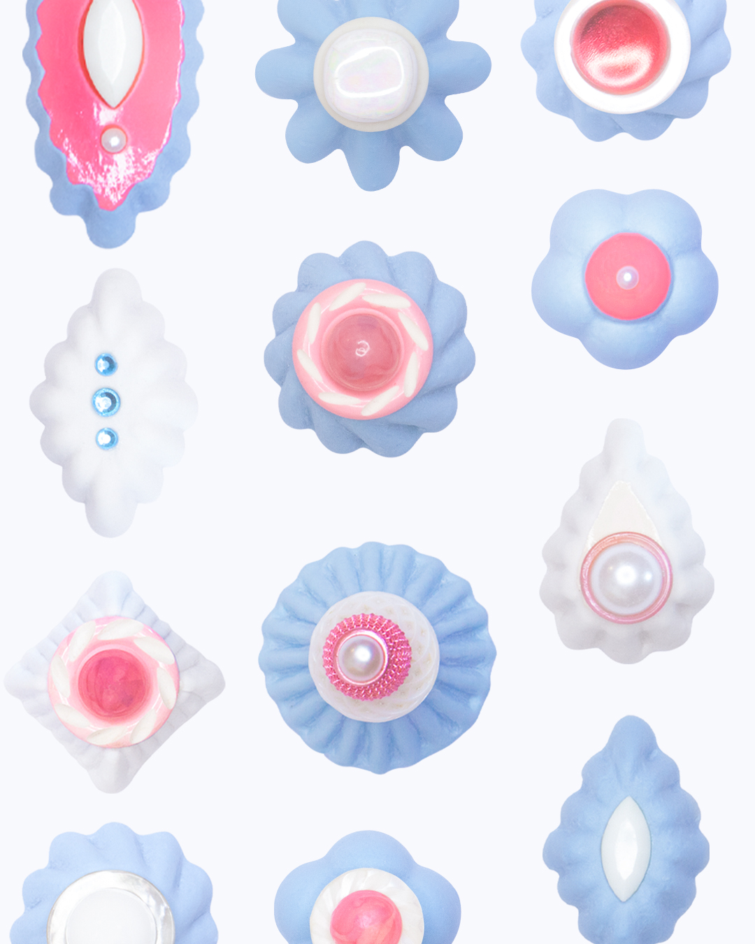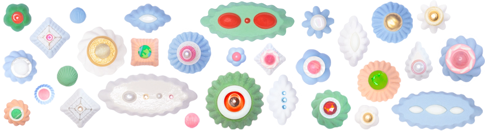 Miniature porcelain desserts.Icing, glaze, and fruit coulis made from rhinestones, cabochons, buttons, and pearls.2025.