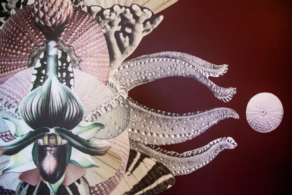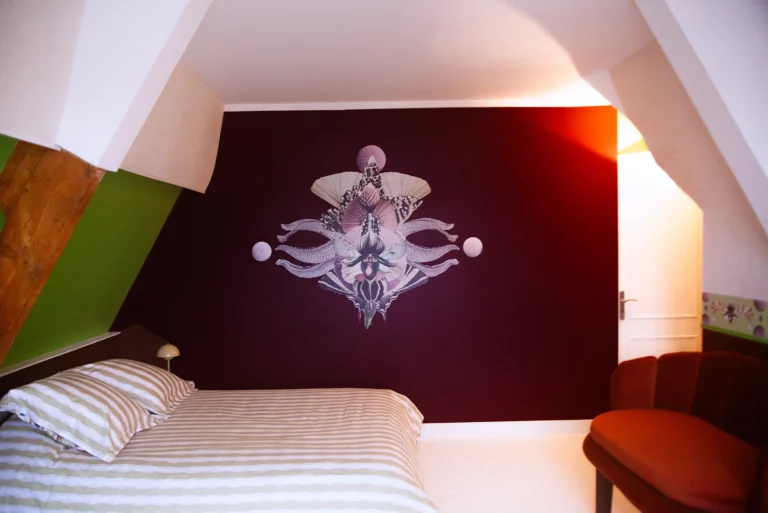 L’Orchidée subaquatique est une espèce de fleur fantastique que j’ai imaginée et qui se déploie en fresque et en frise murales. Son éclosion habite la pièce dans un mouvement lent, presque liquide. Ses tentacules ondulantes accompagnent le regard et viennent habiter la pièce.